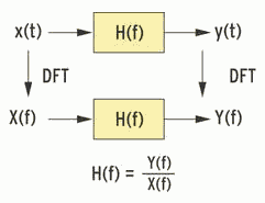 Das Verhältnis zwischen dem Ausgangsspektrum Y(f) und dem Spektrum des Eingangssignals X(f) entspricht der Übertragungsfunktion H(f) des Systems (siehe Abbildung 1). Die Berechnung des Quotienten zwischen Ausgangs- und Eingangsspektrum muss natürlich berücksichtigen, dass beide Spektren mathematisch komplex sind, also Real- und Imaginärteil beziehungsweise Betrag und Phase enthalten.